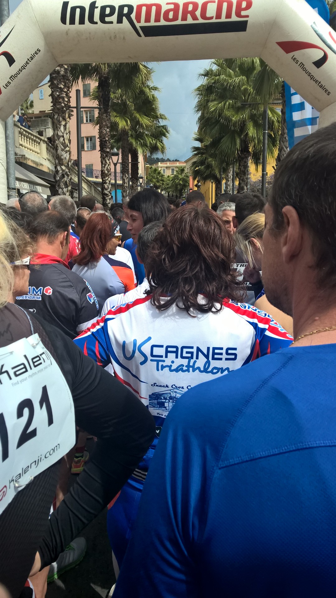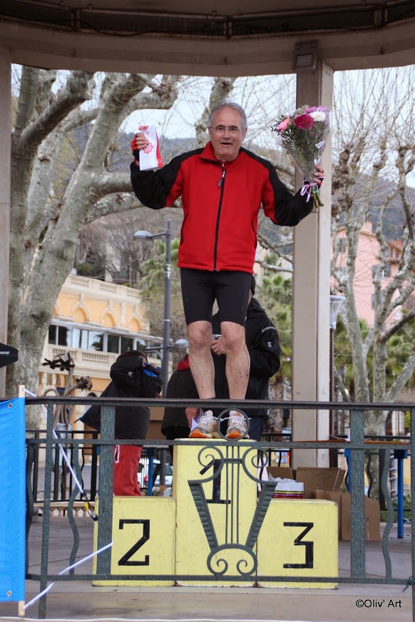 Race started at 13.00 with a 5Km run round the town of Grasse which is the perfume capital town inland from Cannes . The run was flat for about 2,5km and then turned hilly for the other 2.5km. Arrived in transition one feeling OK but took some time preparing for the hilly road bike ride up to the panoramic village Cabris which is nestled on a hill at around 500m (hence panoramic). It was a slow climb up from Grasse to this village via another village called Speracedes.. After Cabris there was a fast steep downhill stretch into Grasse for a second lap. On the downhill section it started raining so had to take it easy on the slippery wet and oily road. Arrived in Grasse for a second lap which was quite a challenges as not done much hill endurance training with my Giant road bike on hilly rides. The second lap up to Grasse was quite energy sapping and the downhill section was quite difficult as the rain had become quite heavy and aquaplaning was an issue and a slow descent was important to avoid an accident. Arrived at transition two and this was reasonably quick turnaround for me. The run on the same course as outlined above was slow especially on the hilly section going up to the finish. Arrived at the finish very tired but did a brief sprint which was initiated by the support team as well as the applause of the organisers, participants and spectators and this was followed by a brief interview by the compare. At the prize giving, I was called forward to receive a consolation prize and a photo on the podium with a bouquet of flowers ( My wife Jacqueline was delighted with these) – See below ……