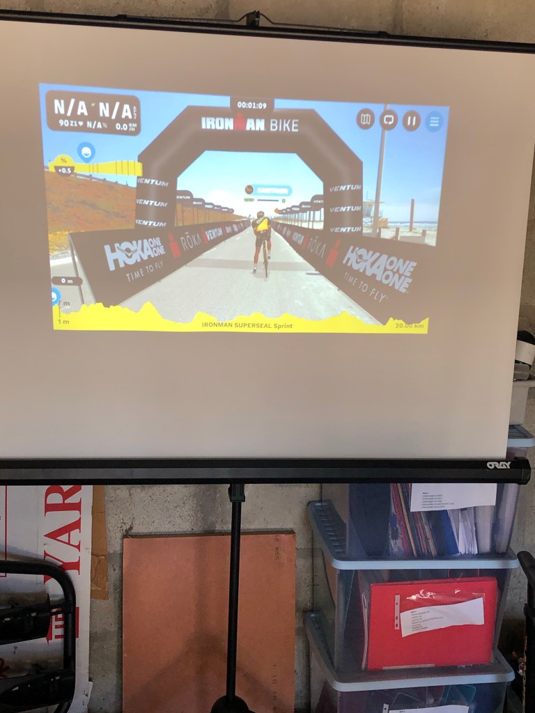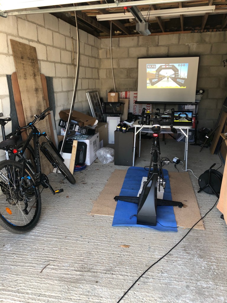 The man cave set up for Saris H3 bike turbo training with my Giant TCR 2.O road bike.