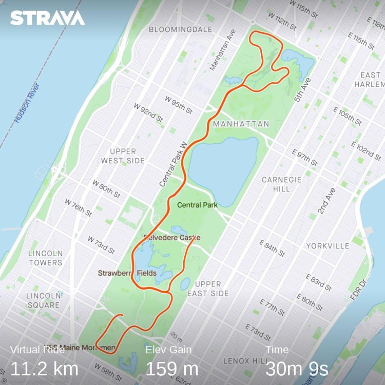 11.2km virtual bike ride around New York Central Park route which brought back happy memories of doing my 9th Marathon in New York in November 2007 (other 8 at London), where I flew there and back on the same plane as Paula Radcliffe from Nice to NYK, who won the women’s race a few hours quicker than me! Also proposed to Jacqueline after the race on a horse and carriage ride in central park as the Irish carriage owner was feeding his horse. She said YES!