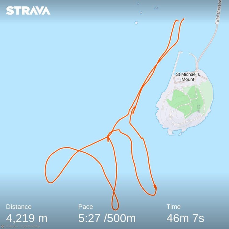 4.2km gig row in choppy seas around the Mount. Good technique session with the novices