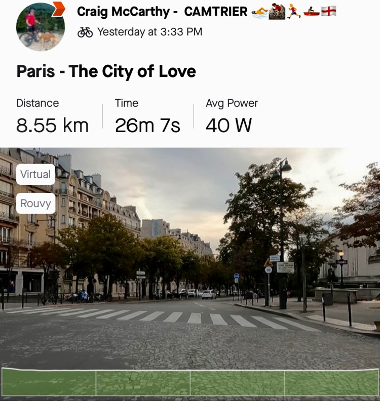 8.5 km virtual ride on WattBike on the Paris route. Quite easy as there was a power problem on the bike that needs to be sorted out. However quite nice to see the Paris City again.