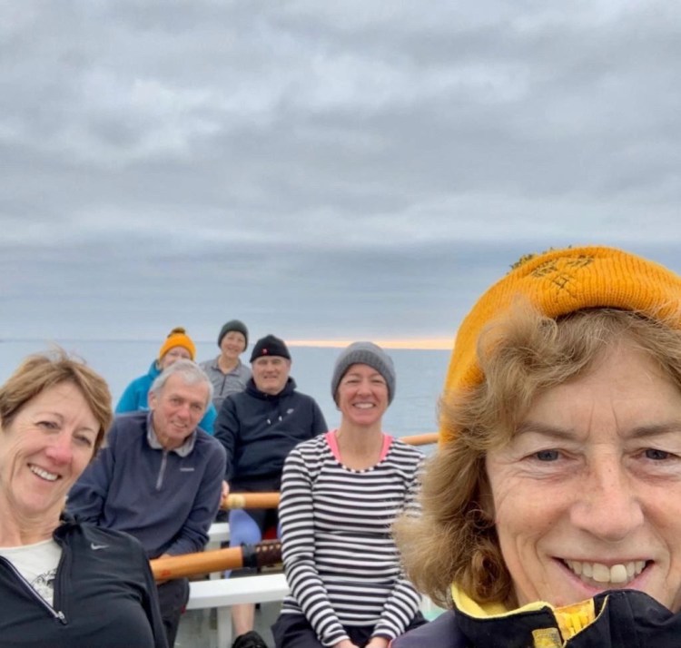 Lovely gig row round Mount on calm seas for a change. Cold but light breeze. Cox: Maxine, 6 :Sandra, 5: Becky, 4: Andy. 3: Me, 2:Shirley, 1:Pat