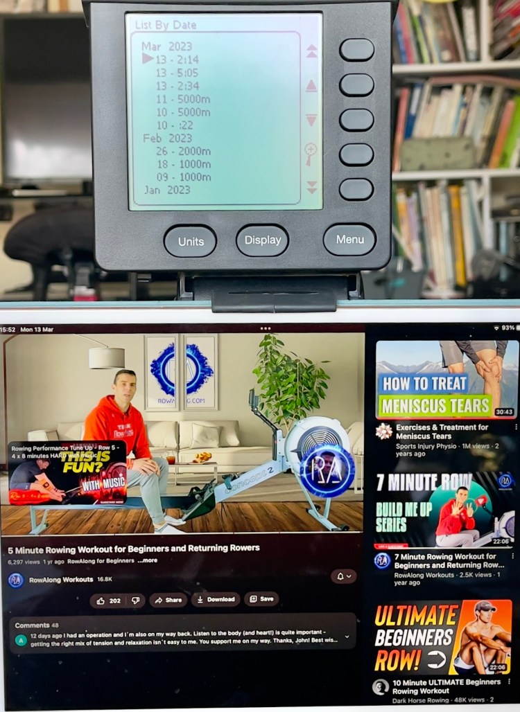 10min technique training with RowAlong Instructor John Steventon followed by a 1km blast using some of the tips gained from this Youtube video. This was followed with some overhead lats, single dumbell rows, dead lifts with barbell and some other weight sessions on the arms.