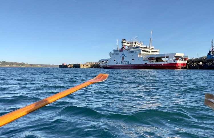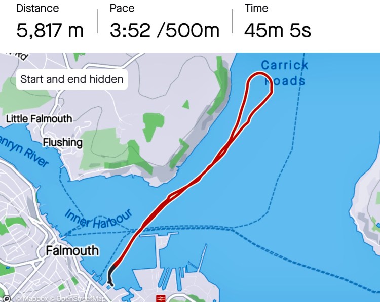 Training session with 3 other members of the Coverack Gig Club Supervets Scillies team. Cox: Sophie, 6: Gary 5: Louis, 4: Me, 3: Peter, 2: Andy 1: Lynette. Launched from Falmouth Watersports centre. 8×2 minute hard sessions with starts of 2 long, 4 fast followed by long race strokes.