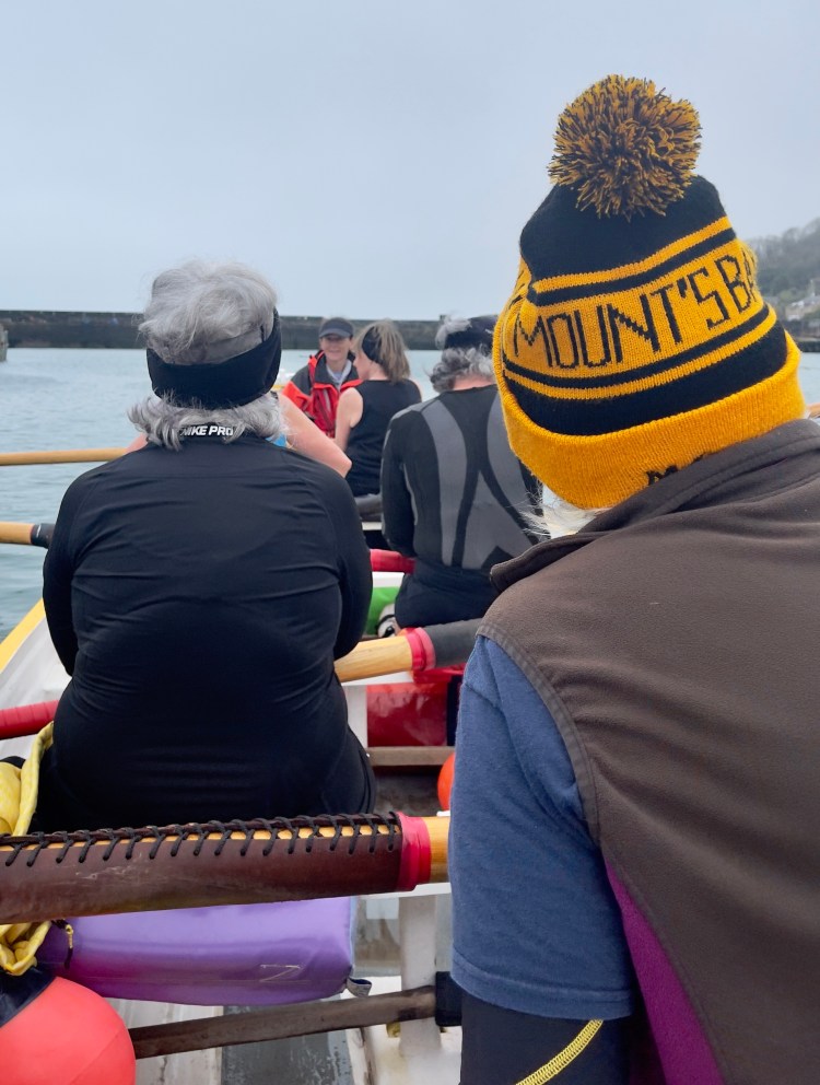 Afternoon Gig Row with MBPGC Ladies Supervets Team going to Scillies Cox: Teresa, 6 Zoe, 5: Liz, 4: ?, 3: ? 2: Shirley, 1: Me. This was mainly in harbour but went out into choppy seas. Did plenty of hard pyramids.
