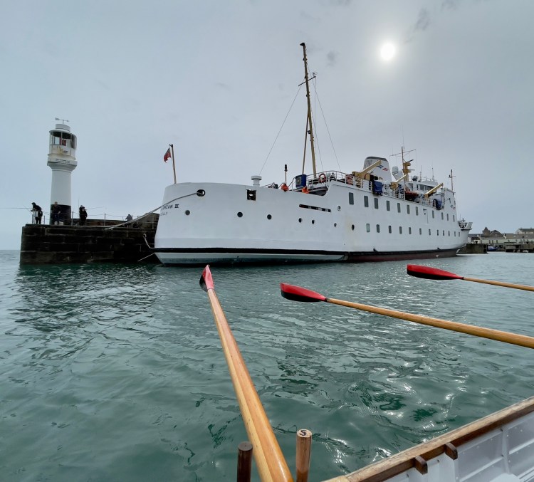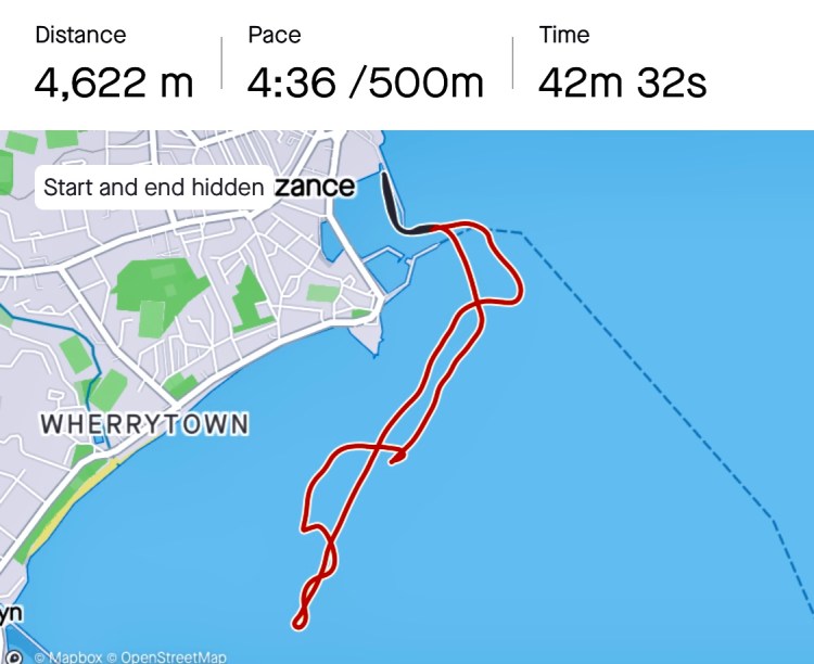 Men’s Crew training from Penzance harbour. Cox: Julie, 6: Jemima, 5: Al, 4: Chris, 3: Me, 2: Steve, 1: Kevin. Lots of practice on race starts as well as lengthening the stroke while racing