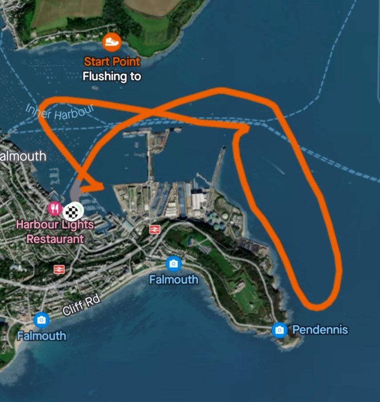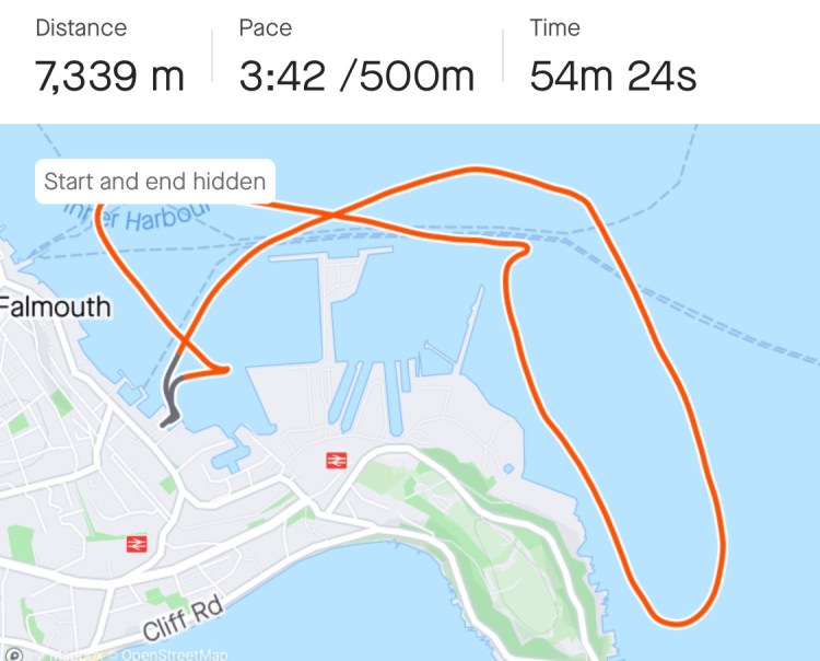 Nice gig training gig row with CGC Supervets team with a fill in for Martin with Pete’s son. Cox : Tim, 6: Ted, 5: Jon, 4: Gary, 3: Pete, 2: Me, 1: Andy. Lovely sunny day with a slight easterly wind. Rowed out of the Falmouth harbour into more choppy seas. Then did two full race practice with starts that simulated the Scillies Championship race distances. That is St Agnes – around 3km and Nut Rock around 2.2km. Good crew practice for Scillies Gig Championship with the mini Scillies at Helford with the full crew and Sophie as Cox. No photos due to too busy rowing😅