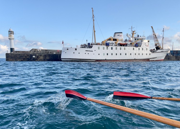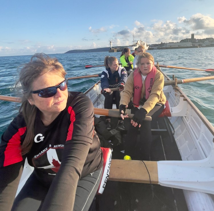 Nice evening gig row out of the harbour doing some light training activities. Cox: Julie, 6: Tina, 5: Me, 4: Kerry, 3: Claire, 2: Cara, 1: Jonny. Jez in back seat and replaced me.