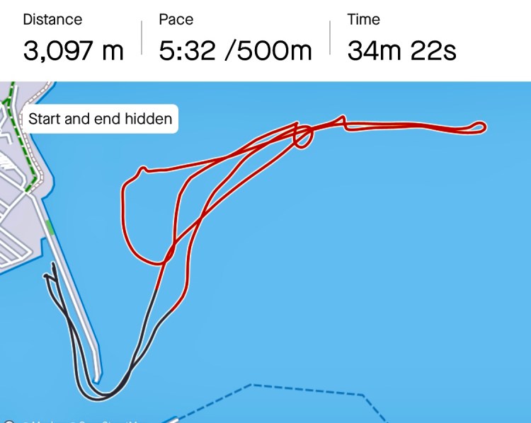 1st Race with Morladron against Fortitude. I was in Morladron in seat number 2 with Julie as cox and Steve / Tina as part of crew. Three races which we won all 3. After this the crews changed and I went into Fortitude with Steve C, Steve M and Trevor. In the second race against Maladron we won the first and lost second. Good night training practicing racing and buoy turns in both in the six crew gig and the four crew gig. Beautiful sunny π evening and reasonably calm seas.
