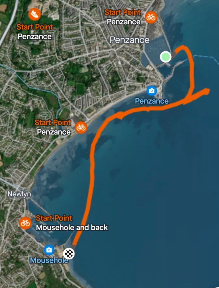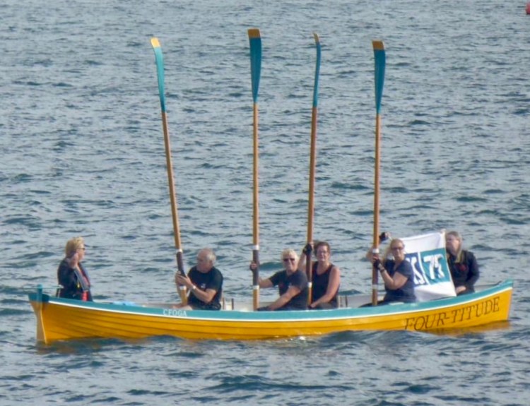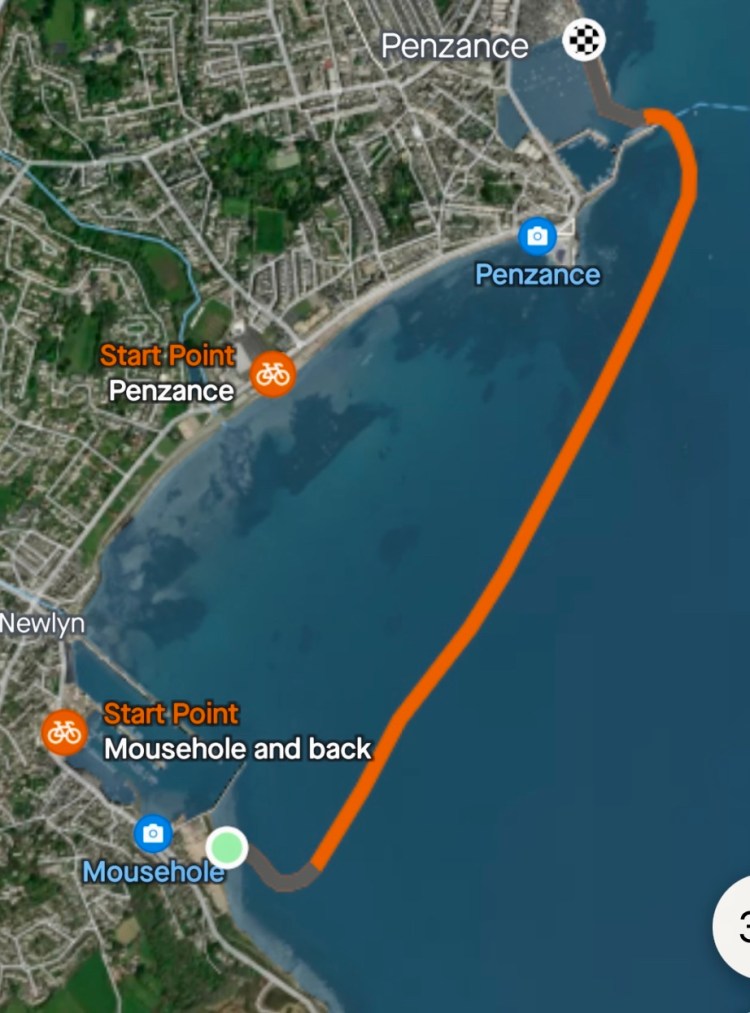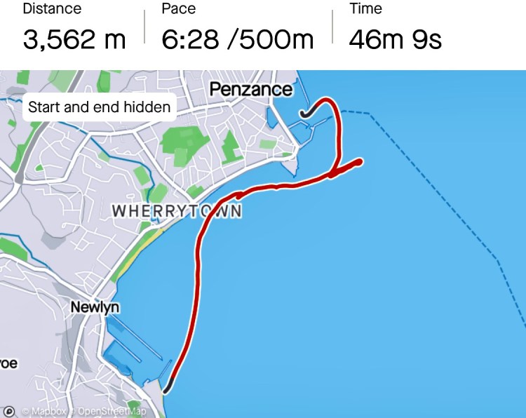 We rowed from Penzance Harbour along the sea front and onto Sandy cove and back. First row to Sandy cove below in the flighty four oared gig Cox: Wendy, 4: Me, 3: Trevor, 2: 1: Cara with flying the flag. Little choppy and β