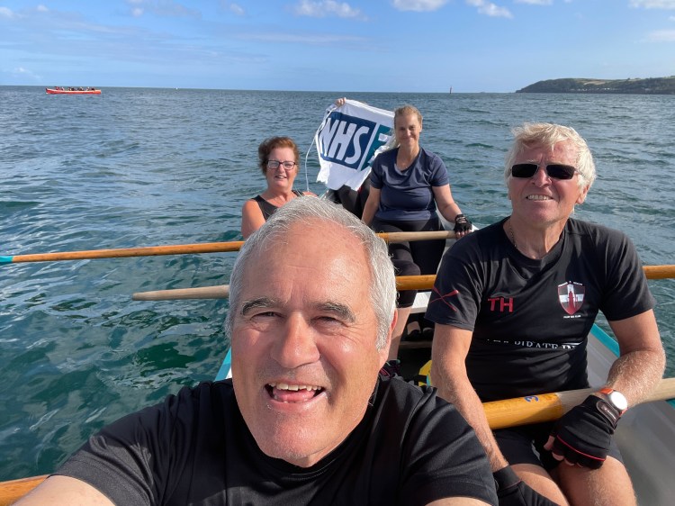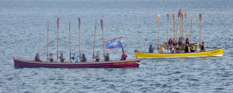 Penzance and Newlyn Pilot Gig Club (PNPGC) led a row along the Penzance sea front to Sandy Cove. We had two boats π£ββοΈ out the six oared Morladron and four oared flighty Four-Titude fully crewed seen above where I was in stroke. Morladron crew below with oars up and flying the thank you to the NHS flag. We were also joined in this row with our friends in Porthleven gig club who brought two boats energetic and π£ββοΈ to support our initiative.