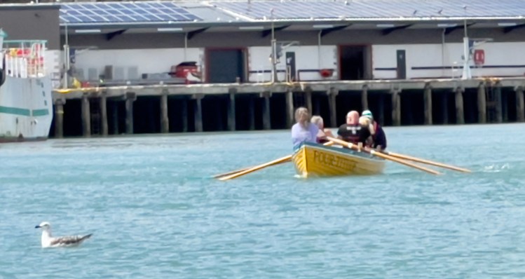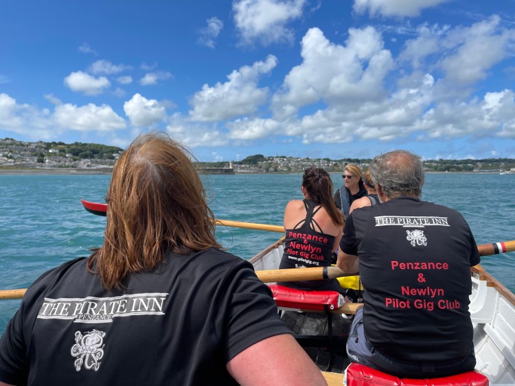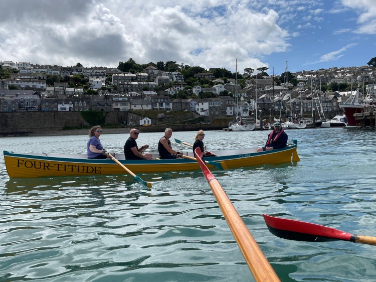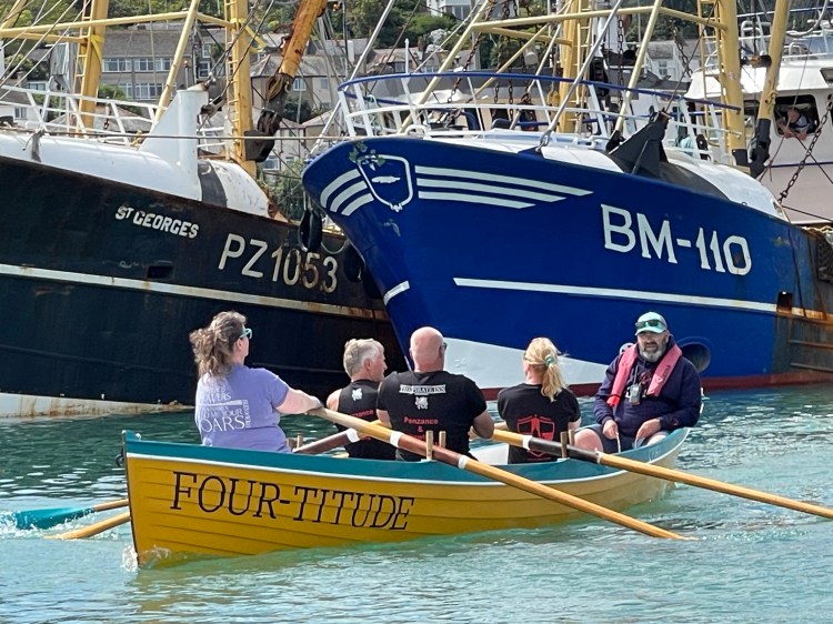 Training row to Newlyn Harbour and back. Morladron and Fort- itude taken out on choppy waters. Cox m: Wendy 6: Jem, 5:Julie, 4: Steve, 3: Sarah 2: Me and 1: Janice
