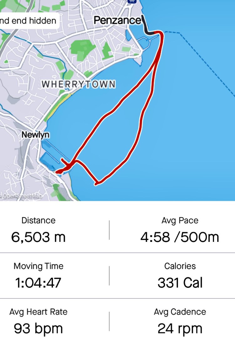 Training row to Newlyn Harbour and back. Morladron and Fort- itude taken out on choppy waters. Cox m: Wendy 6: Jem, 5:Julie, 4: Steve, 3: Sarah 2: Me and 1: Janice