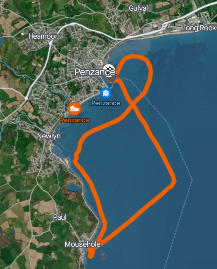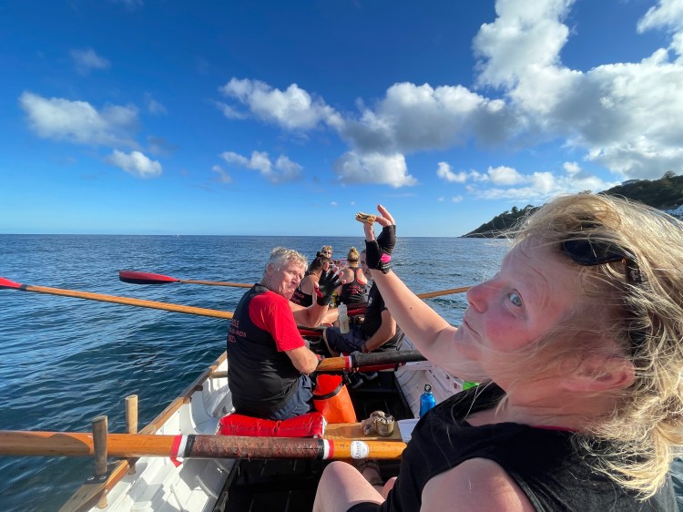 Long 13km row training for the Great River Race in September. Cox; Wendy, 6:Jemima, 5: Julie, 4: Steve, 3: Trevor, 2; Alison, 1: Me. Long row out to a large oil tanker and then back to Mousehole. Good endurance row. Afterwards went to the Dock for a few š»