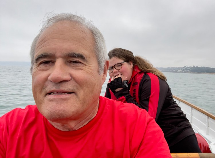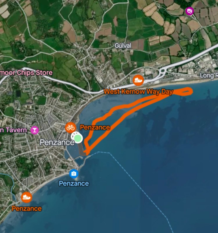 Nice relaxed training row around penzance harbour and towards the Mount and back. Cox: Wendy, 6: Trevor, 5: Emma/Steve, 4: Cara, 3; Sarah, 2: Me, 1: Jan.