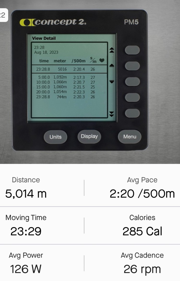 Quick training 5km, 23min virtual row on C2 RowErg. Like to bring the pace down to under 2min.