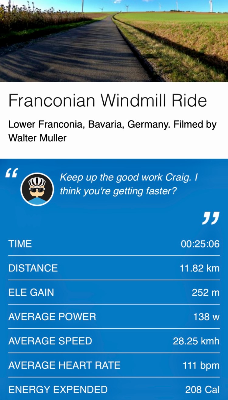 Quite a rolling hilly ride in Southern Germany π©πͺ. Had a few problems getting the program to work but once set up a great short ride.