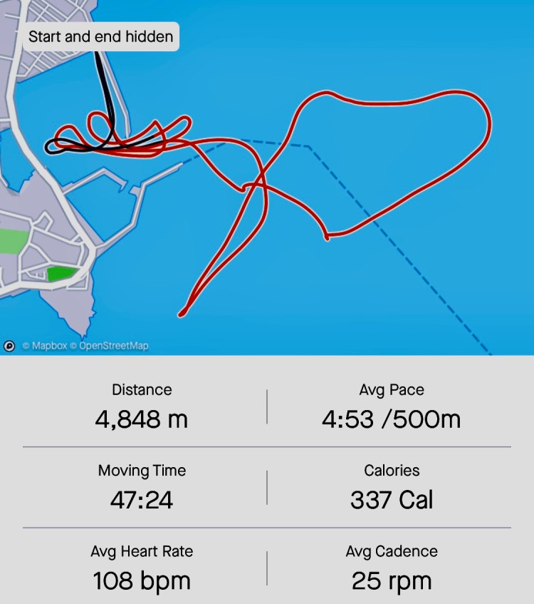 Nice training row in messy seas outside the harbour which was great training. Race starts, power pyramids and technique training. Good to be on the water again after celebrating my birthday š„³ and limited rows due to weather. Cox: James, 6: Jem, 5: Julie, 4: Tina, 3: Trevor, 2: Alison, 1: Me . Wendy as coach.