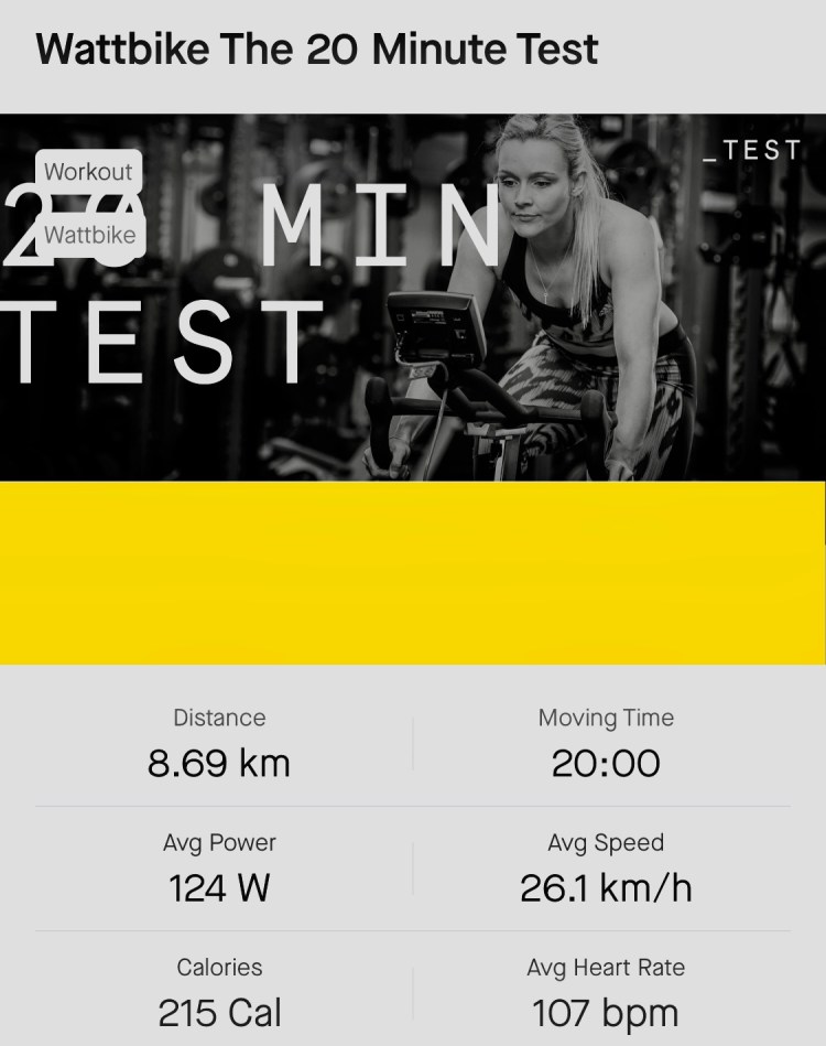 After Strength session a 20 minute WattBike test to determine FTP for regular sessions, however on Ergo setting seemed difficult to up the power going at 90 plus cadence. After this did a 1000m RowErg cool π down as follows.