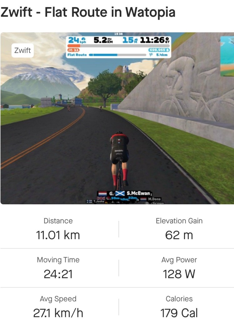 After strength session did a spin on WattBike on the flat zwift route. Miss the ROUVY and Fulgaz rides as more scenic and ride routes numerous compared to WattBike and Zwift.