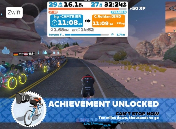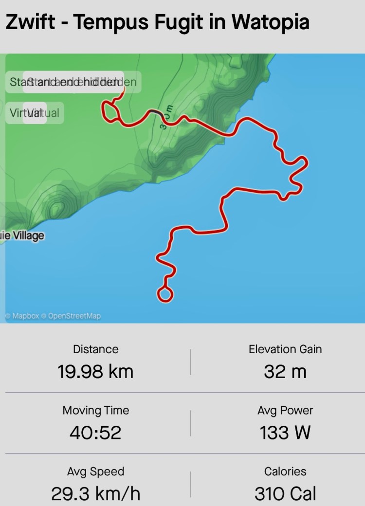 Nice 20km virtual aerobic training ride on WattBike on the Zwift Tempus Fugit Watopia course. This was followed by 20 minute strength training which included 50 crunches, 1minute plank, 20 barbell bench press (20kg), 10 dumbell bicep curls (10kg), 10 dumbbell one arm row L&R (10kg), 20 Tricep extension (5kg) 20 Squats with 20 Kg barbell