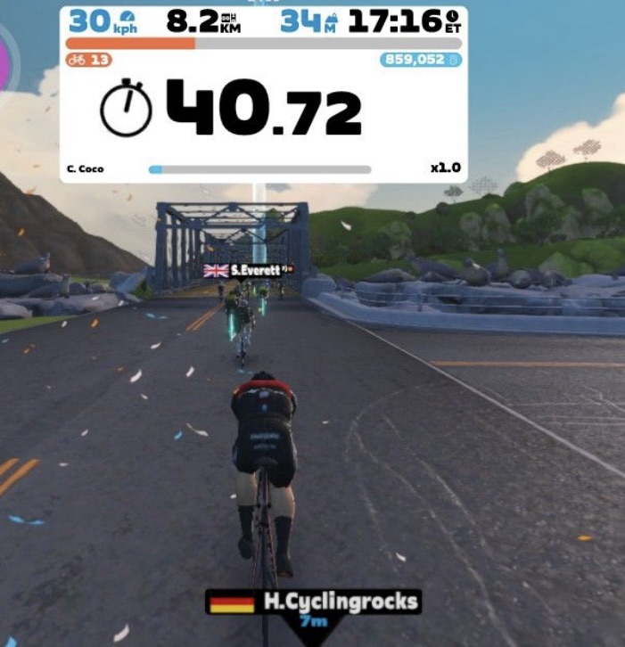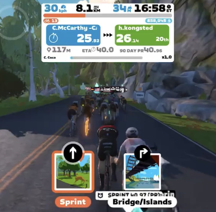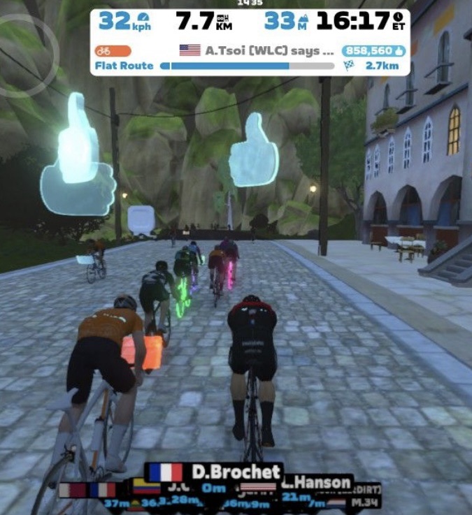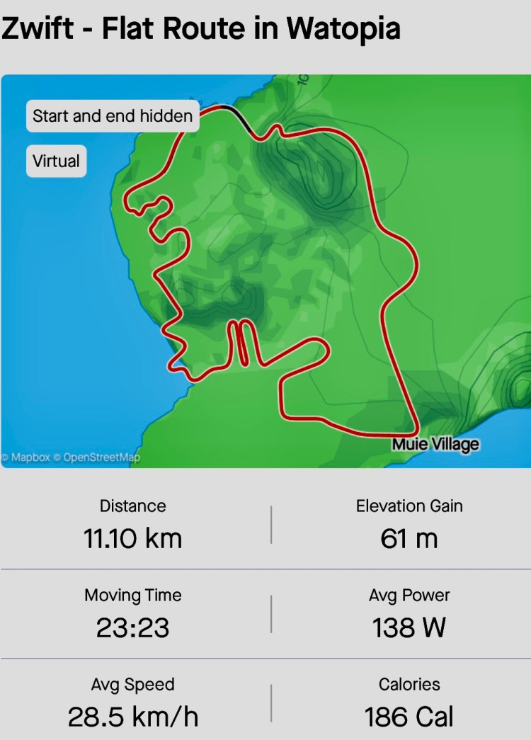 Short 2km warm up C2 RowErg followed by a virtual WattBike ride on a 11km Zwift course as shown below.