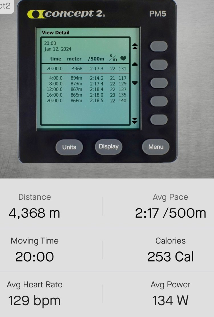 Quick Erg 20 minute session followed by strength session consisting of 20 dumbell single arm rows, 10 barbell bench press, 20 dumbell tricep curls, 20 barbell squats, 1 minute plank, 30 crunches on Swiss ball