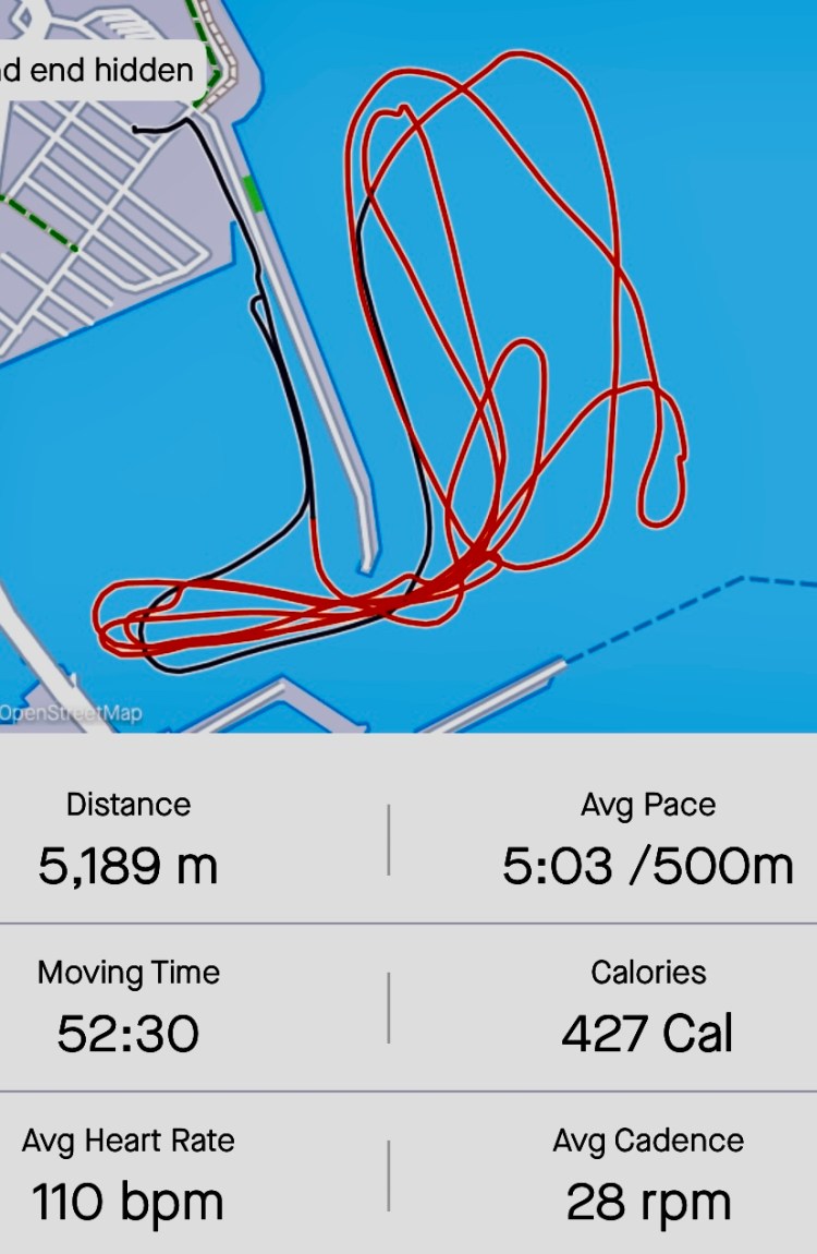 Good training row in awful weather with lots of rain and choppy waters. Cox:Jim 6: Steve, 5: Emma, 4: Claire 3: Jonny, 2: Kevin, 1: me. Plenty of race starts and practicing technique in choppy waters. Also stroke technique training for power and feathering.
