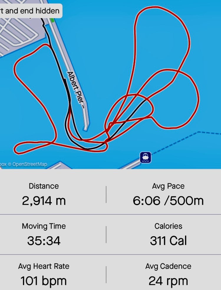 5.45 Evening training row: Cox: Jim, 6: Nina, 5:Emma, 4:Me 3: Kevin, 2: Janice 1: Ivan passenger and coach Julie. Easy row but weather Ok but sea a bit choppy.