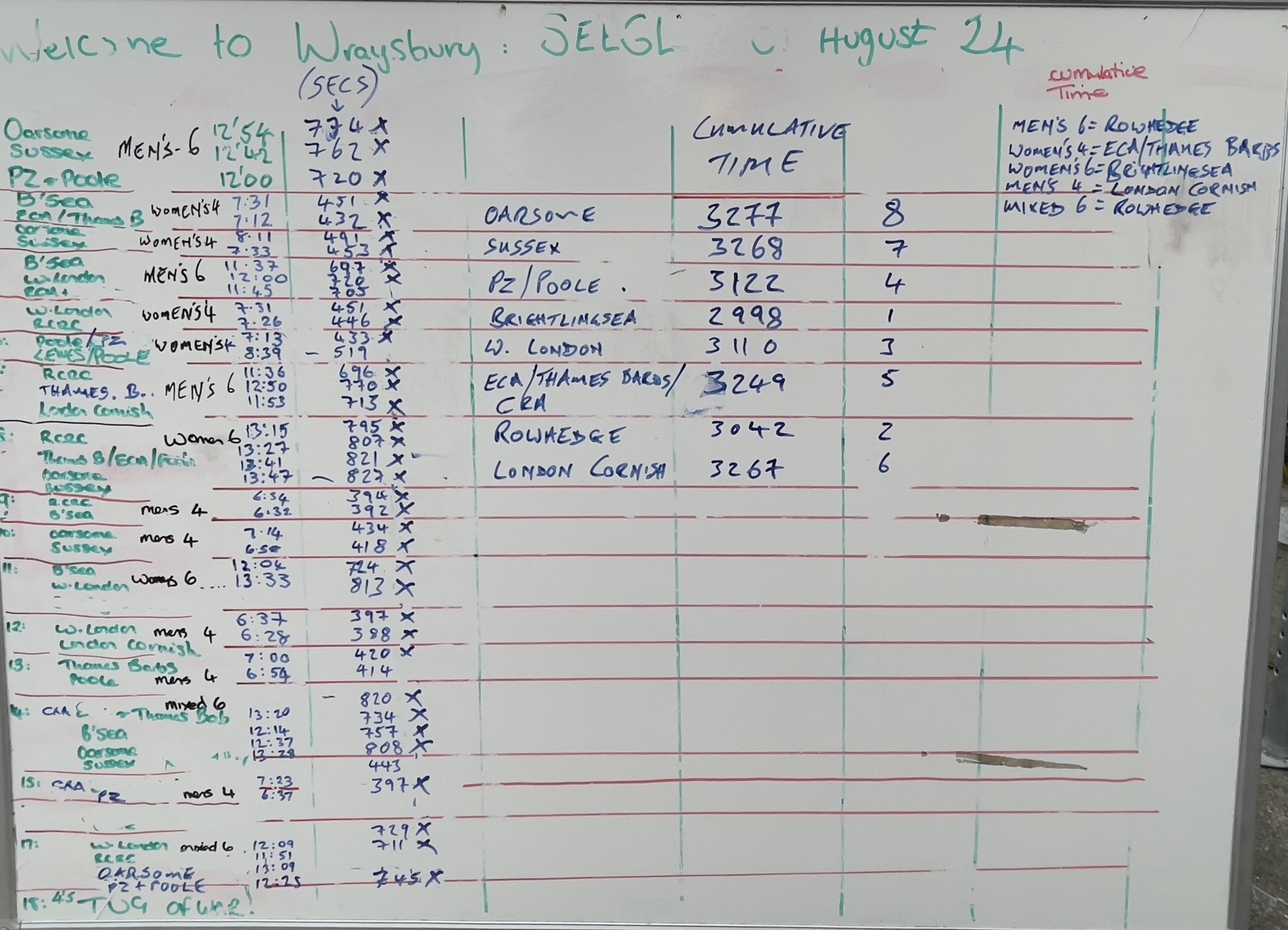 Some great racing followed which is shown on the results board later.The next race was the men’s four oared gig race gig race heat which included us three plus a rower from Rowhedge. We won this convincingly. Trevor was 4, James 3 RCRC rower and 1 me.