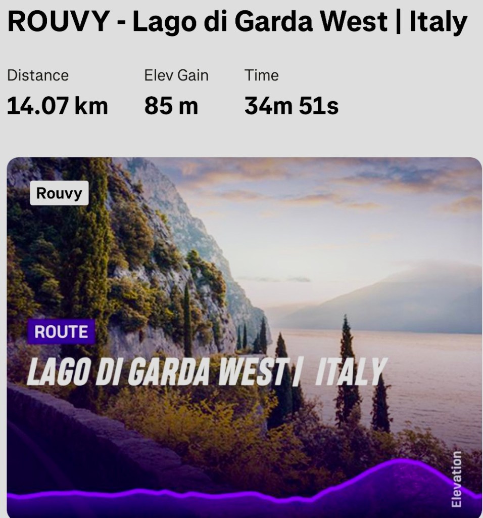 Nice fast ROUVY route on lake Garda West in Italy ๐ฎ๐น. Hilly towards the end. Lovely scenery and reminds me of the time we holidayed there with a camper van. Time constricted, so only did 14 Km, just before hill climb