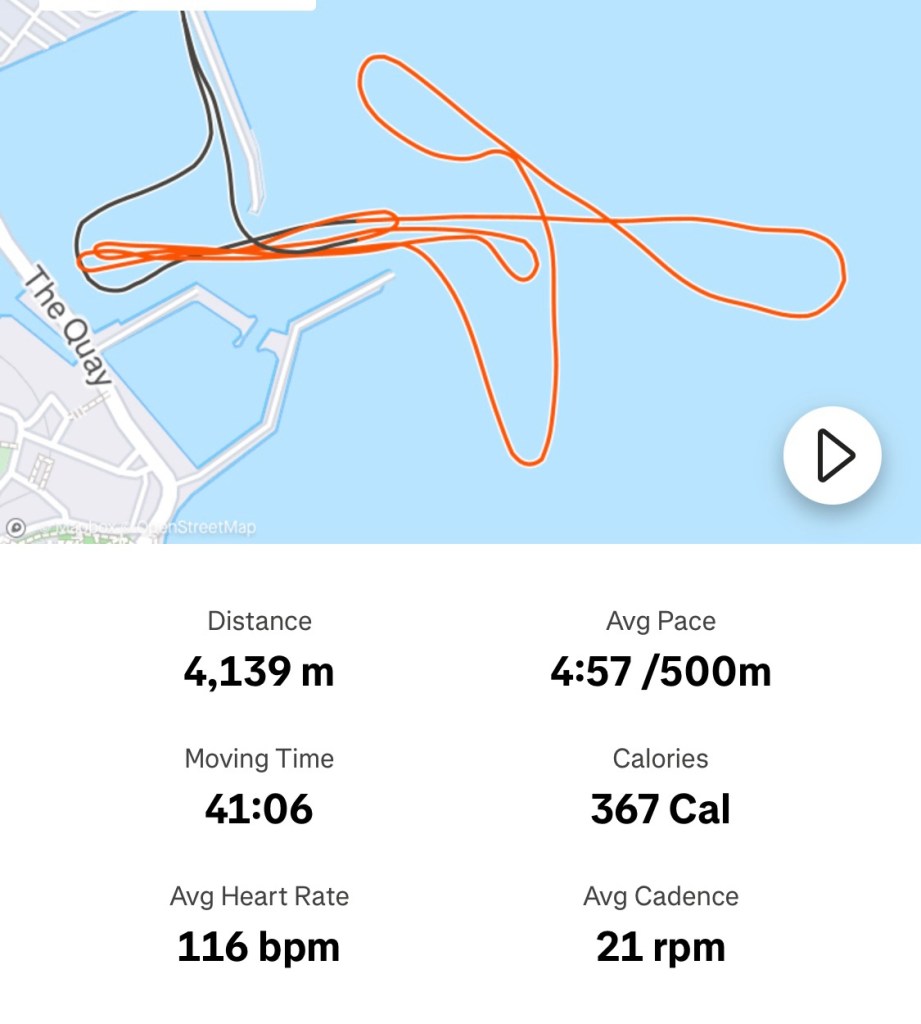 First night row in calm seas and mild night. Plenty of technique and racing starts on a lovely evening. A mixed crew as follows: Cox: James/Trev: 6: Tina, 5 Jayne , 4: Steve, 3: Nina 2: Me, 1: Janice.
