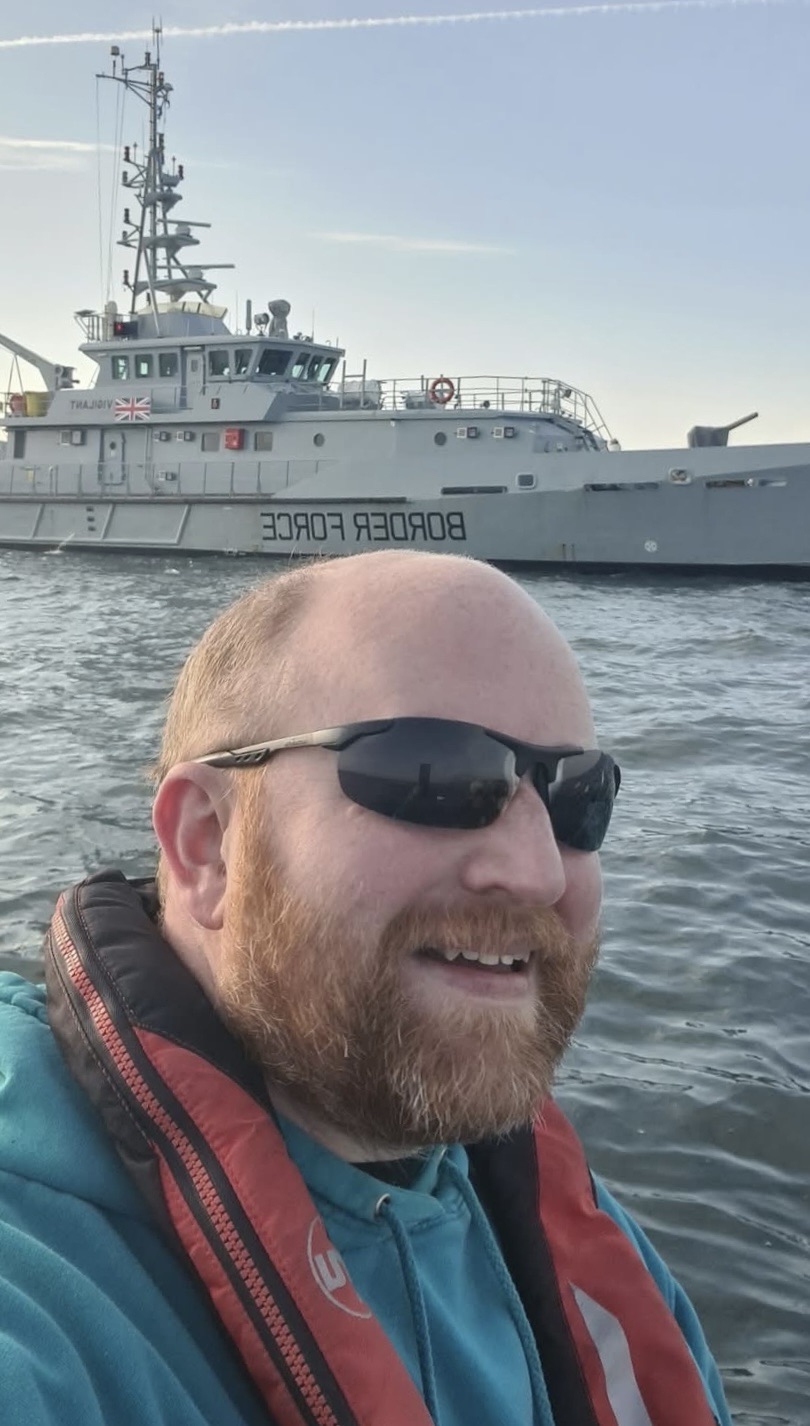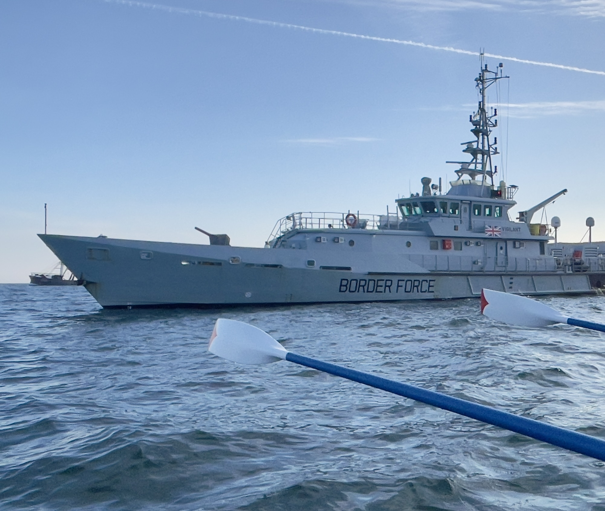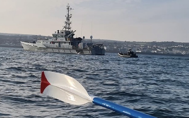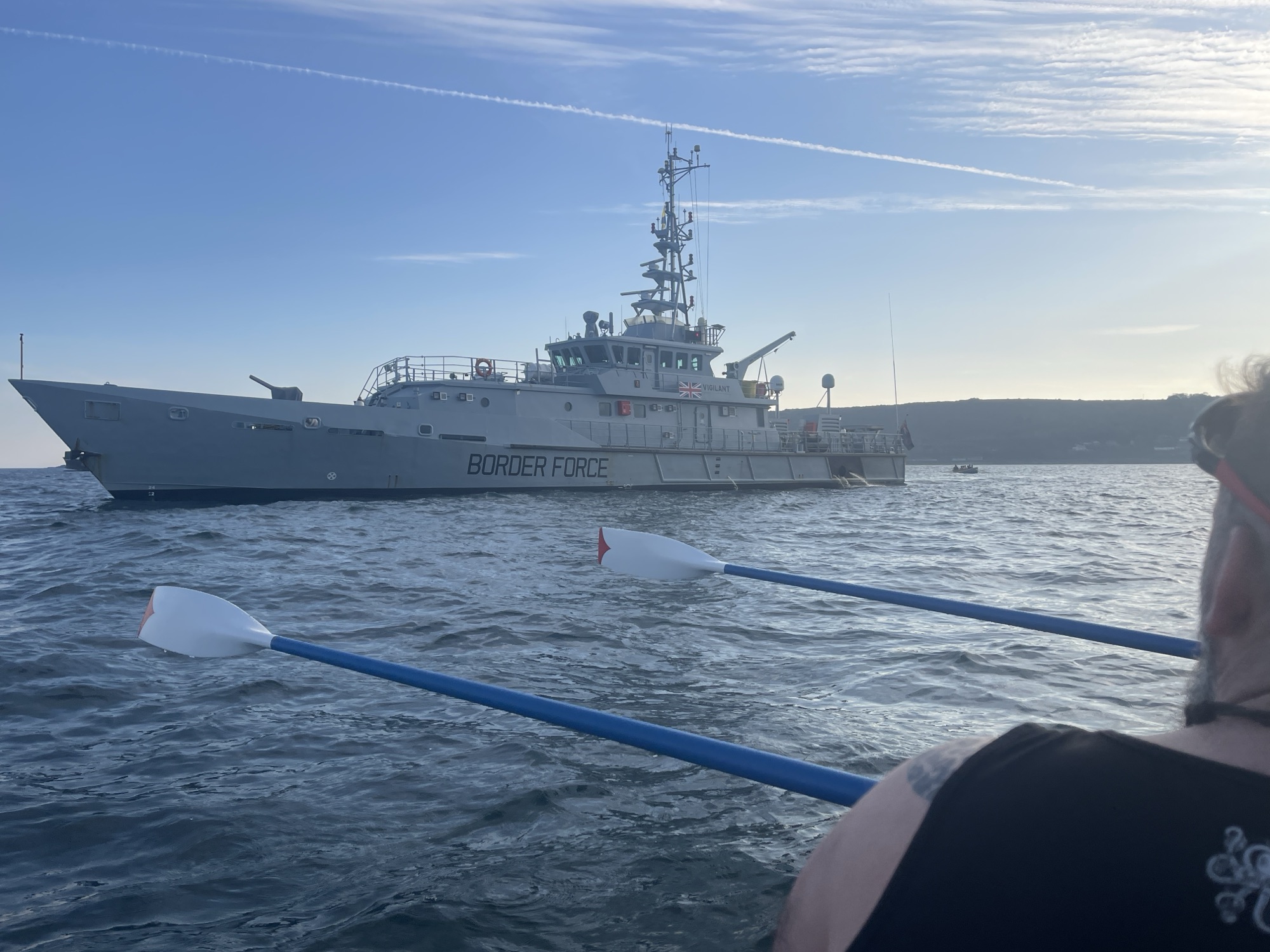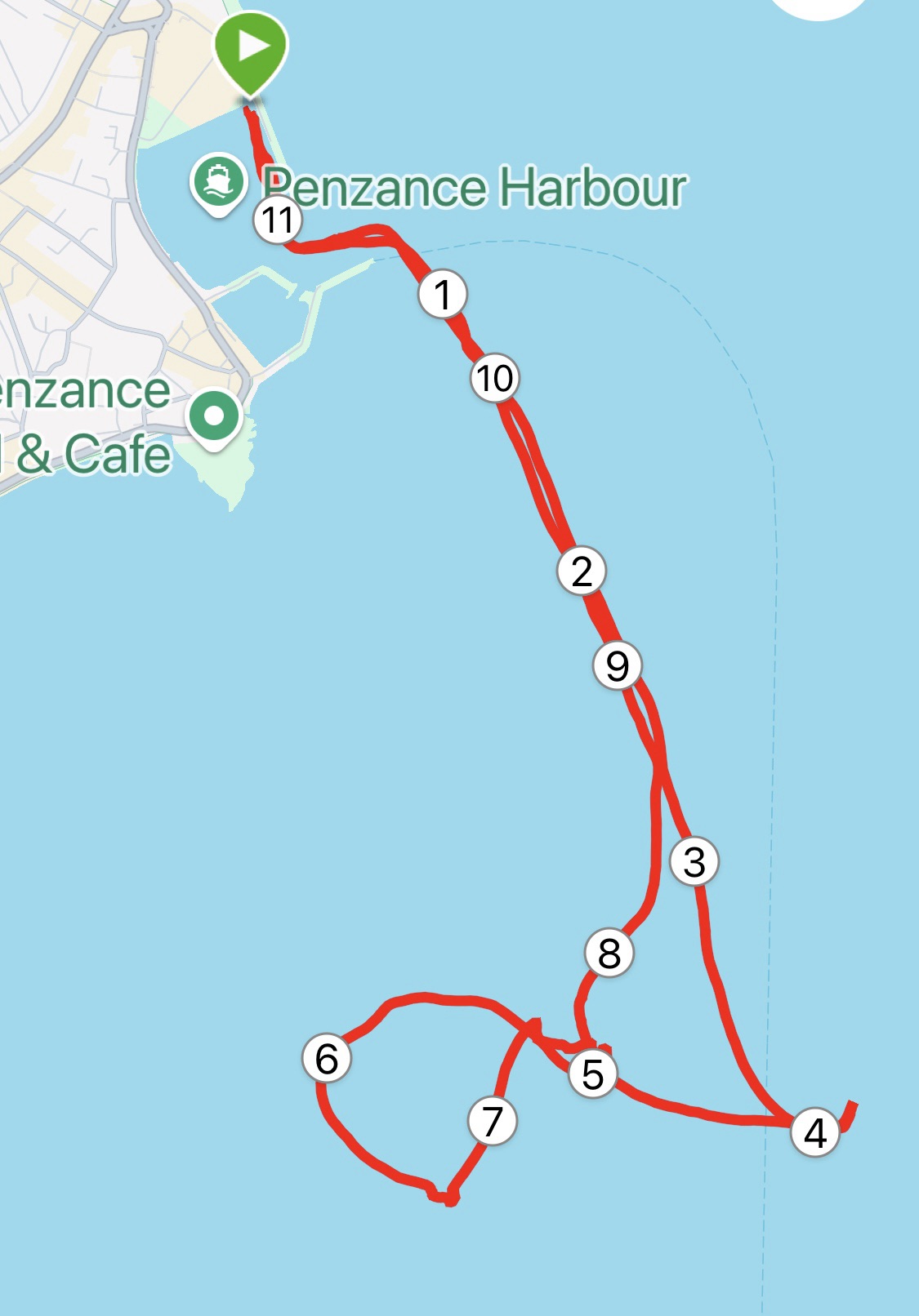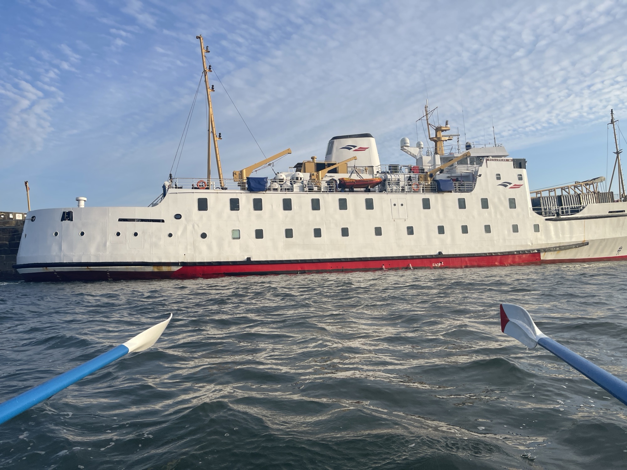 Wind dropped again and sea much better than yesterday. Rowed out forcefully to Border Force boat 🛥️. On way back did some starts and worked on technique. Good training session. Cox: Jim, 6: Steve, 5:Trev, 4: Ant, 3: James, 2: Me, 1: Duncan. Finally view of Scillonian that Pat us on the way back