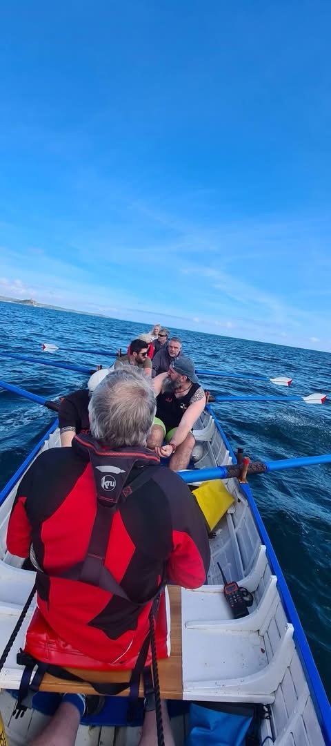 Last PNPGC vet Scillies team training row before the Scillies world champs in Rhos coxes: Jim/Trev 6: Steve, 5: James, 4: Tom (fill in) 3: Barry, 2: Me, 1: Duncan. Few racing starts and a solid row in slight swelly seas. Looking forward to racing in our boat which is waiting for us on the green in St Mary’s – See our boat tucked away at the top with our PNPGC name on the black cover 🏴☠️