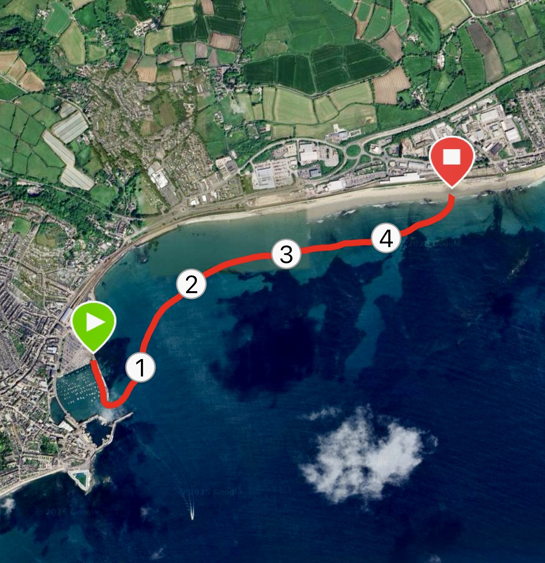 Rowed from Penzance Harbour to Longrock beach for a BBQ and swim. Cox: James, 6: Trev, 5: Tom, 4: Wendy, 3: Michelle, 2: Me, 1: Jayne. Pilot: Gillian