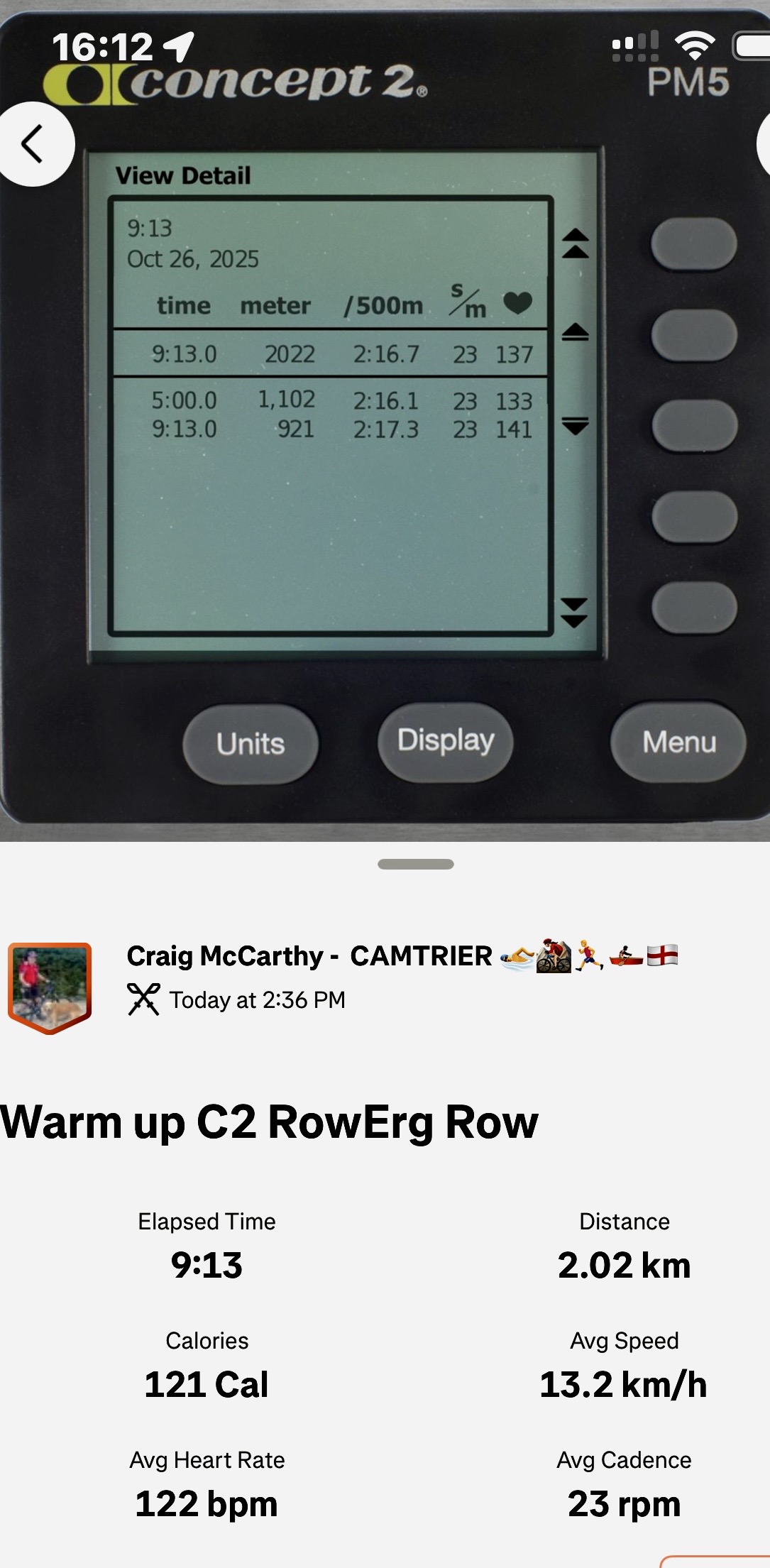 Quick 2km warm up row followed by an extensive strength session with core and stretching as follows: