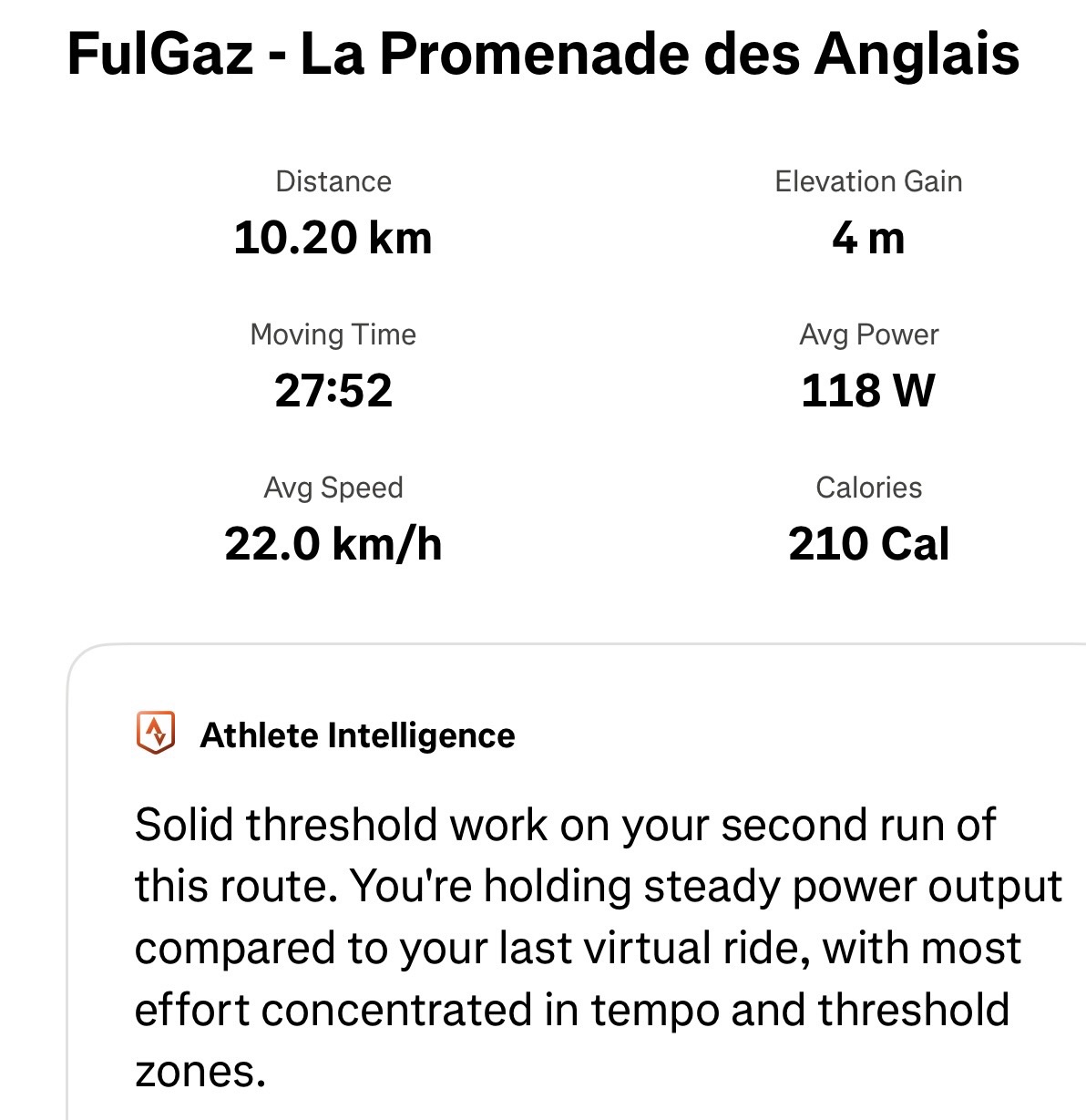 After a few days off training back to a nice WattBike ride down the Fulgaz promenade des anglais route in Nice France 🇫🇷. A route I know well while living in France as I Did this route running 🏃♂️ a 10 Km more than 10 times at the beginning of each year with my good friend and best man Ivor.