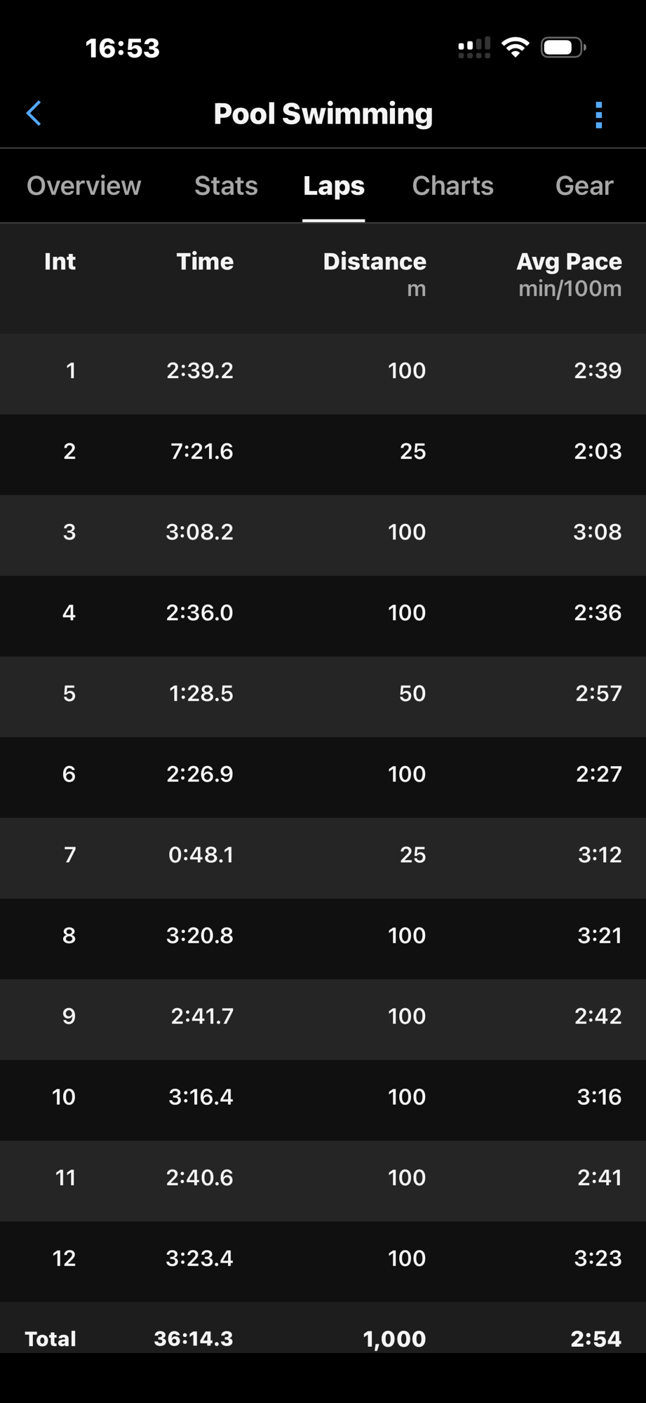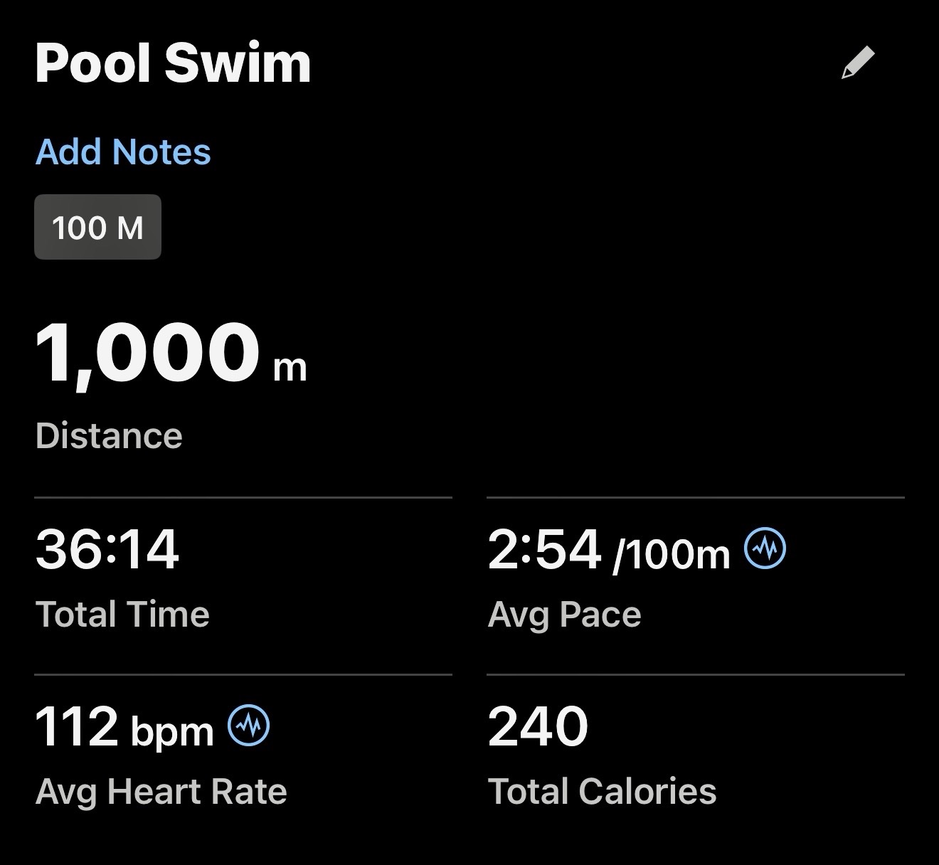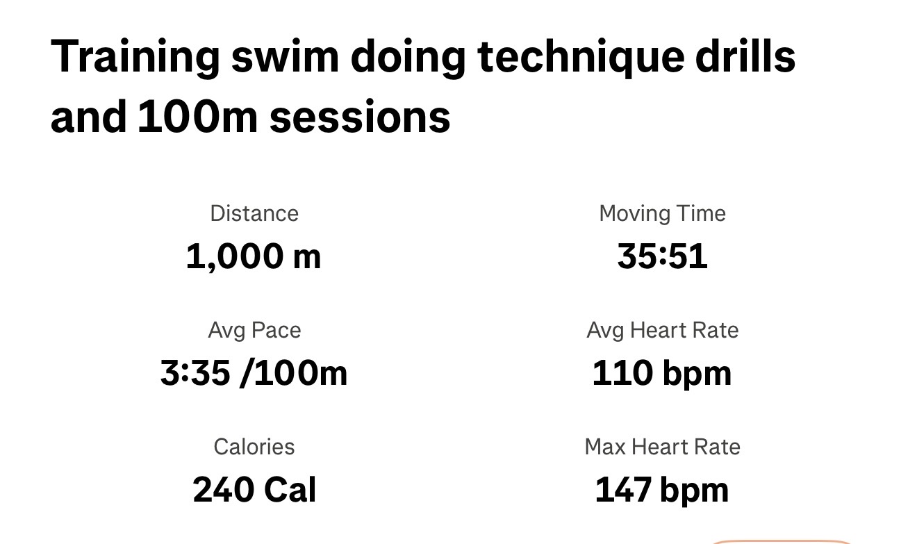 Over I Km over swimming practicing different drills to improve my freestyle stroke using short flippers & pool buoy as well as general 100m sessions. Real issue of sinking legs and poor catch and pull. Using pool buoy increased my speed due to less drag from sinking legs. Using flippers for swimming on the side drills to encourage better roll during the stroke. Also did a bit of bilateral breathing.