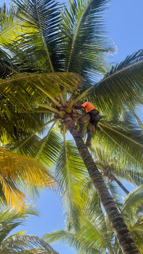 Wednesday 24 December 2025: Nice breakfast followed by a day on the beach. Took it easy with plenty of sunscreen and keeping in the shade. Watched a Barbadian tree surgeon ๐ harvesting coconuts ๐ฅฅ ๐ด . Needed a helmet on the lilos ๐