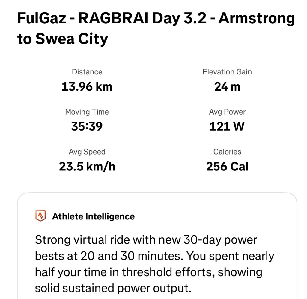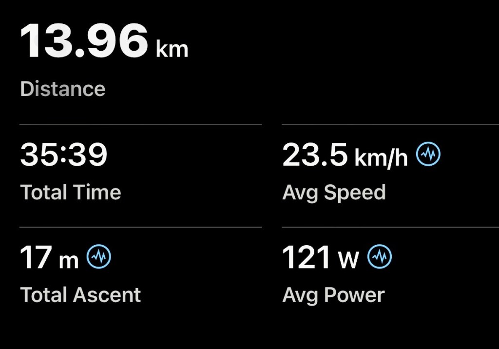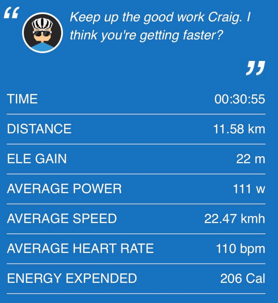 After several weeks not doing a lot other than eating drinking and swimming did a 11.5 Km Wattbike training ride as follows: