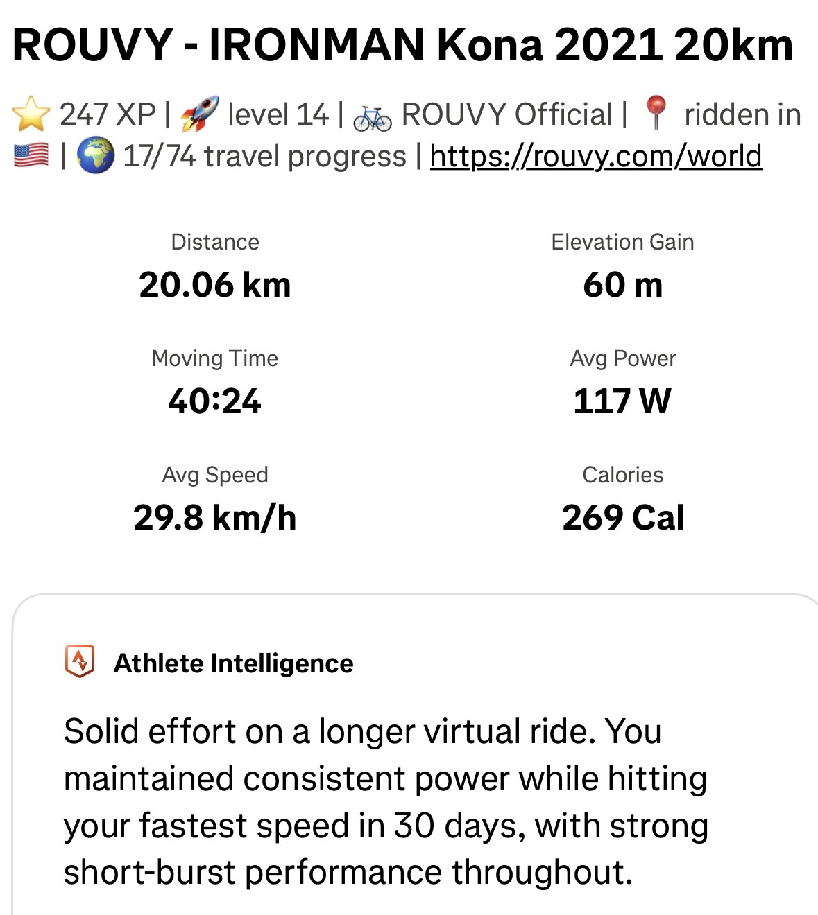 Nice 20km training ride on ROUVY Ironman Kona course in New Zealand 🇳🇿. Hope to visit Kona sometime when in New Zealand. Followed this with a 7 minute cool down ride as follows