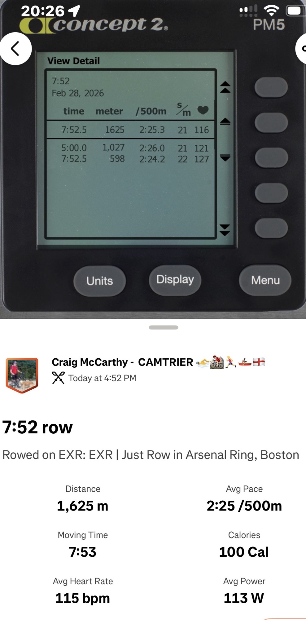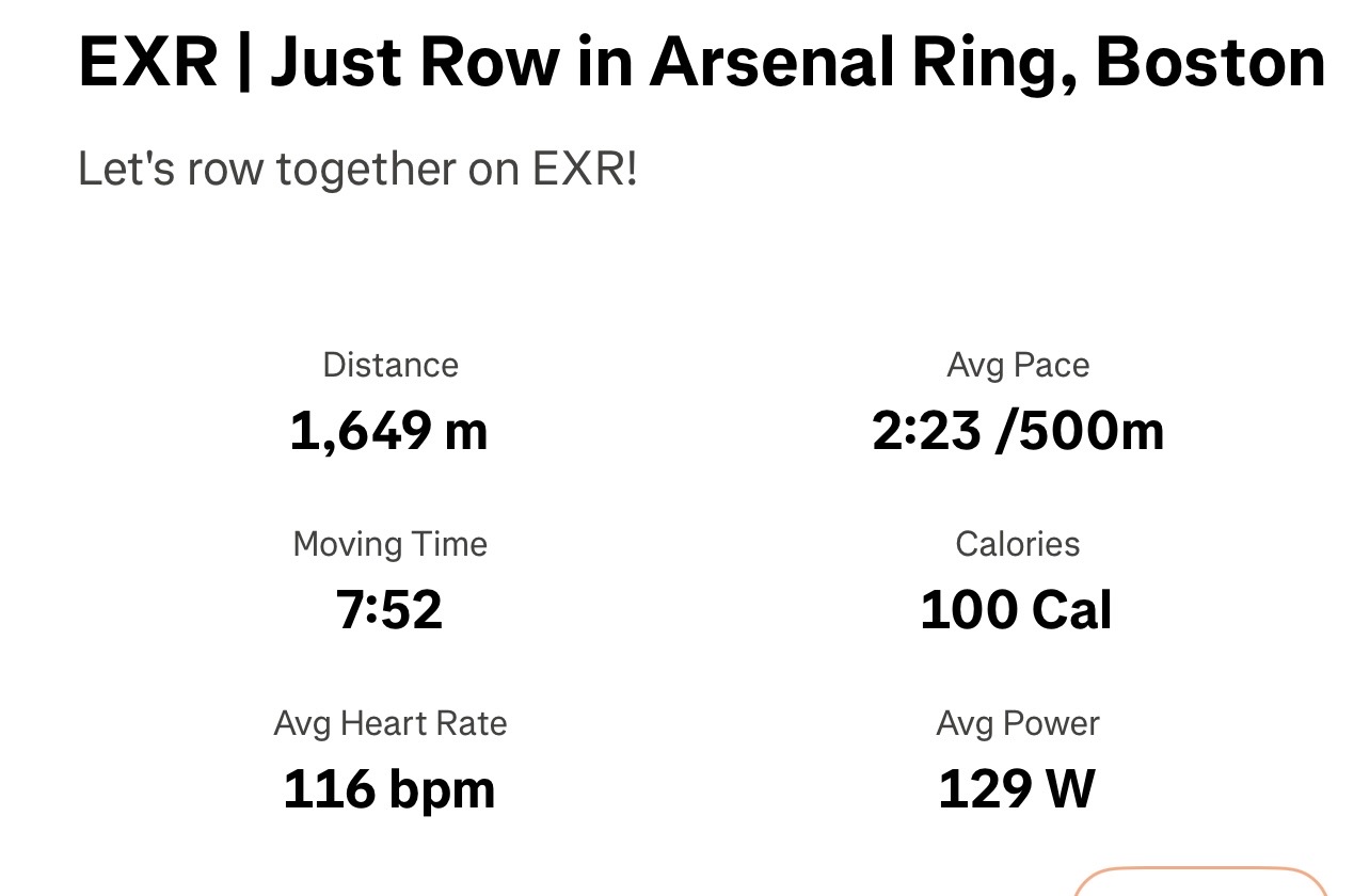 Quick 1.6 km RowErg training virtual row on a EXR Boston River training route. This was followed by a strength session.