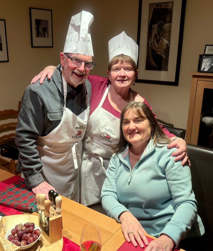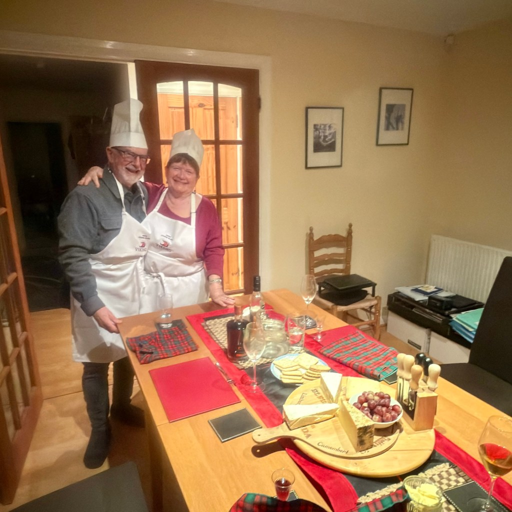 Drove 5 hours up to our friends Alan and Sue in Staines for a catch up and lovely dinner. They even dressed up for us with their Chef’s costume that they received on their cruise with Viking. Great evening and start to the trip