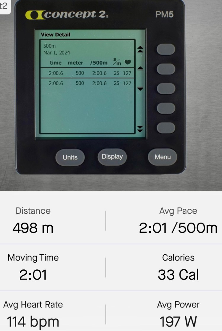 Friday 1st March 2024: Couple of warm up C2 RowErg virtual rows followed by a WattBike virtual ride session