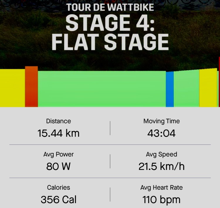 This was an flat fitness Tour de WattBike training ride after several weeks recovering from a virus. Other information sent by WattBike with further stats on the ride