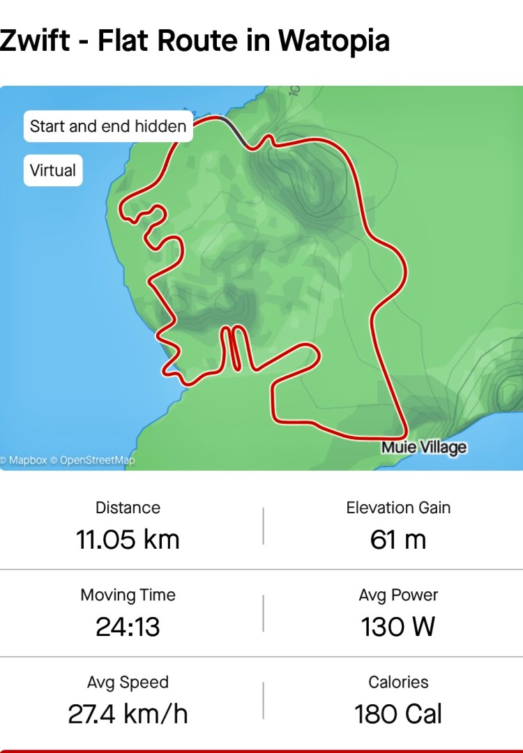 Nice short ride on the Zwift flat route. Need to work on increasing power on Zwift.