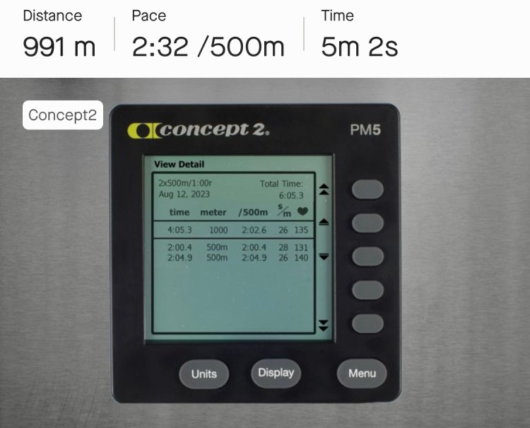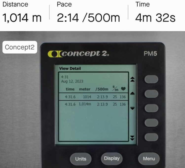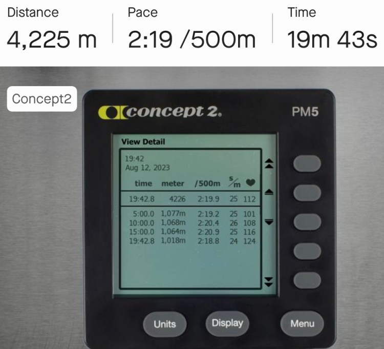 Quick training 5km, 23min virtual row on C2 RowErg. Like to bring the pace down to under 2min.