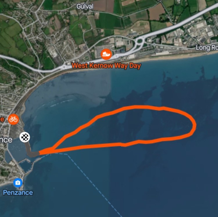 Quick training row for GRR around the Penzance harbour. Cox:Wendy, 6: Jemima, 5: Julie, 4: Tina, 3; Trevor, 2: Alison, 1: Me. Good training session in very choppy snd messy seas and heavy rain, Not a great evening to row but did a good steady row with a number of starts and power strokes. Afterwards went to the Longboat for a few drinks with the crew. Busy in the pub as a Liverpool match was on where they drew with Chelsea. Lots of laughs with the crew in the back room with a few 🍻. Reached the 20Km second week rowing target on the Concept 2 Dogs Day Challenge following reaching the 10km target the previous week. Feeling cold and wet 🥶 But having fun 🤩