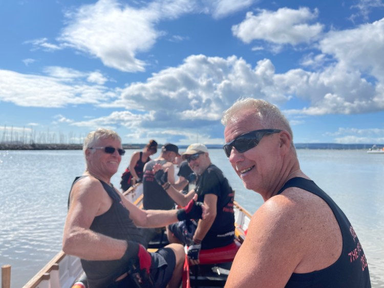 The first men’s race was the 9km round two islands. The crew was Cox :Andy 6: Bill 5: Stuart, 4: Steve, 3: Trevor, 2: Phil, 1: me. Great stroke rate and good race in our heat against 8 boats. We came 4th and pleased with that as the youngest was 52 and the rest in late 60s around 30 to 40 years older than most other crews. See route below with my strava of the whole journey including 1.5 km rowing out to start.