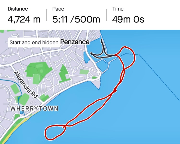 Evening row in a cold dull choppy evening. Trained on racing starts, buoy turns and good technique in choppy conditions in Penzance harbour – really nice session. Cox: Julie: 6: Al, 5: Emma, 4:Me, 3: Steve, 2: Jemima, 1: Jayne and Janice in the seat. Some great turns in the harbour opening. Cox Julie really worked us to improve our timing and length of stroke 😊👍